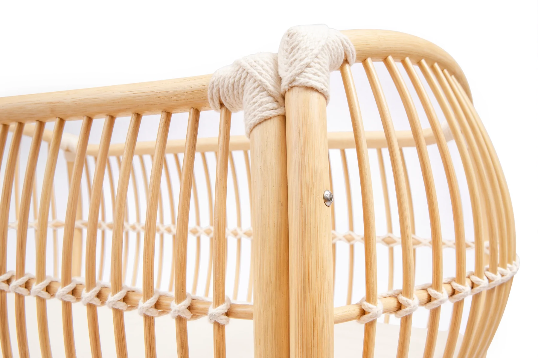 Mit dem Beistellbett MARTHA VEGAN ist dein Baby ganz nah bei dir und dennoch in seinem eigenen Bettchen. Durch die schützende und nach aussen gewölbte Wand des Korbes wirkt das Beistellbett wie ein behütendes Nest. Das Beistellbett MARTHA VEGAN hat höhenverstellbare Füße aus Metall. Damit kann das Beistellbett an unterschiedliche Betthöhen angepasst werden. Das Bettchen zeichnet sich durch ein leichtes, transparentes Design aus. Dennoch ist es äußerst stabil. Die schmalen Riemen aus Baumwoll-Seilen verbinden die einzelnen Stäbe des Rattan Korbes und verleihen dem Beistellbett seine enorme Festigkeit. Für eine sichere Bodenauflage sorgen kleine Fußenden aus Eichenholz. Bei Bedarf kann die offene Seite durch das mitgelieferte extra Element einfach mit 4 Schrauben verschlossen werden, sodass das Bett auch für sich alleine stehen kann.