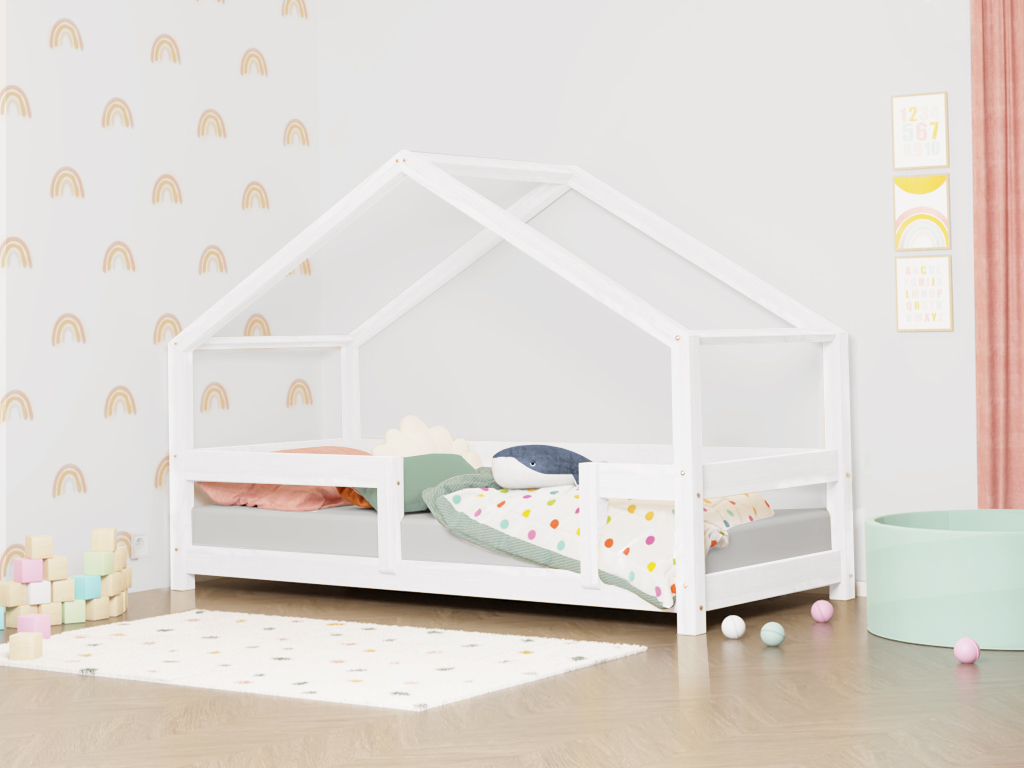 Dieses wundervolle Hausbett mit Rausfallschutz bietet deinem Kind alles was es braucht, um sich nachts richtig wohl zu fühlen. Der Rausfallschutz kann individuell angebracht werden – man kann ihn auch weglassen. Das Hausbett ist handgefertigt aus 6 cm dickem Vierkantholz. Es ist mit ökologischen Farben lackiert, die die Natur schützen und auch für Allergiker geeignet sind. Das Hausbett kann bis zu 150 kg tragen, so dass auch ein Elternteil zum Vorlesen der Gute-Nacht-Geschichte problemlos mit im Bett liegen kann. Der Bettrahmen befindet sich 6 cm über dem Boden, so dass dein Kind leicht aufstehen kann. Das gesamte Bett ist 146 cm hoch. Das Dach beginnt ab einer Höhe von 85 cm. Die Lieferung beinhaltet den Bettrahmen sowie einen passenden Lattenrost. Eine Matratze ist nicht inklusive. Wir empfehlen eine Matratze mit mindestens 18 cm Höhe. Du kannst das Hausbett mit den Zusatzfüßen FOOTS um 10-20 cm erhöhen, um darunter Platz zu schaffen! Die Möbel werden von BENLEMI, einem familiengeführten Unternehmen in der Tschechischen Republik in liebevoller Handarbeit gefertigt. Das Unternehmen BENLEMI gibt es seit 2015. Sie haben sich auf Kindermöbel aus natürlichen Materialien spezialisiert, da sie selbst Eltern von kleinen Kindern sind und nur das Beste für die Kleinen wollten. Daher bekommst du mit einem Produkt von BENLEMI auch nur das Beste für dein Kind! Jeder Baum wird von BENLEMI selbst ausgewählt. Das Holz stammt aus tschechischen Wäldern.
