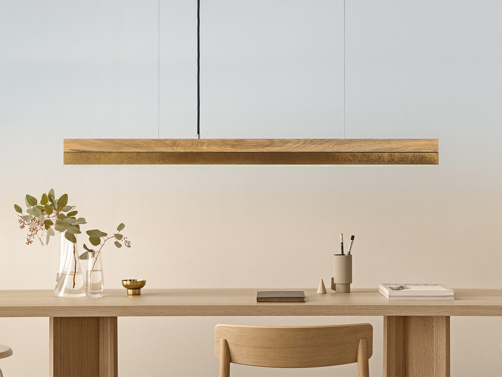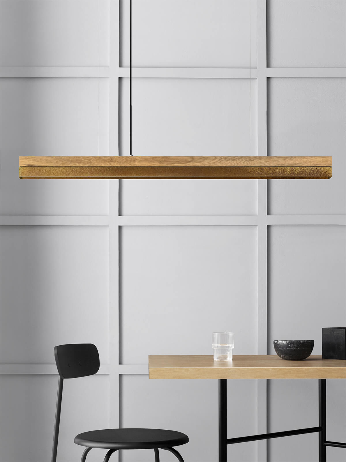 Die hochwertige Hängelampe C-OXI ist eine Kombi aus edlem Eichenholz und oxidiertem Messing, was die Pendelleuchte zu einer zeitlosen und eleganten Designerleuchte macht. Die unterschiedlichen Materialien der Lampenschirme (unterer Teil der Leuchte) lassen sich individuell kombinieren und können jederzeit gewechselt werden.
