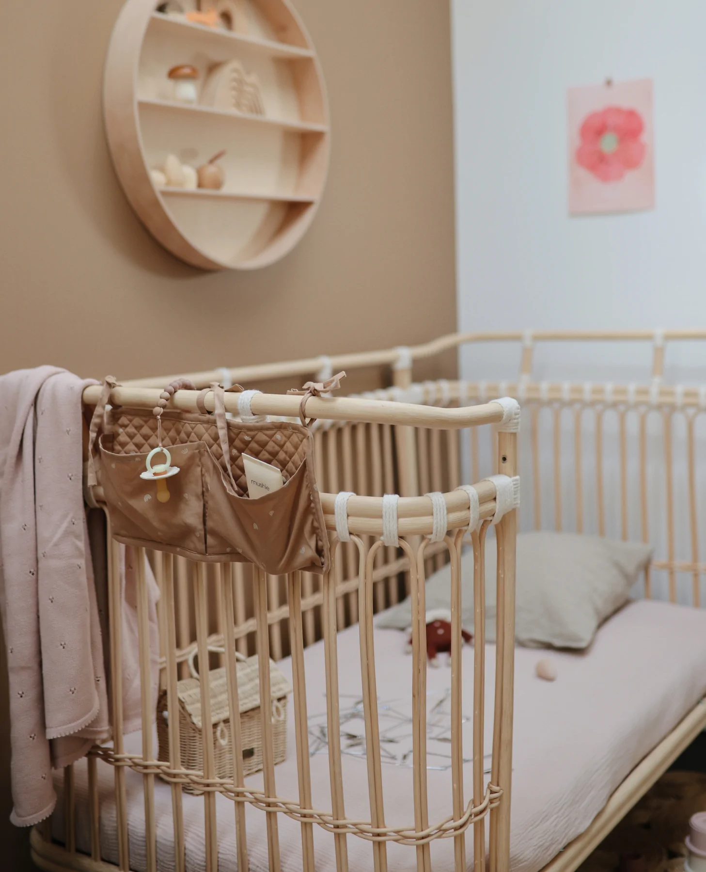 Babybett PAUL VEGAN wirkt auf dem filigranen Metallgestell sehr leicht – beinahe schwebend. Der fein geflochtene Korb aus Rattan ist mit seinen verschiedenen Rohrdurchmessern und seinem einzigartigen Flechtmuster an Design kaum zu übertreffen. Es verleiht dem Babybett eine gewisse Transparenz. So hast du dein Baby bzw. Kind stets im Blick und dein Kind kann bereits seine Umgebung aus dem Bettchen heraus erkunden. PAUL verlängert die Nutzbarkeit des Bettes, indem man ein Element herausnehmen kann. So können die Kleinen auch selbstständig aus dem Bett und in das Bett krabbeln, sobald sie groß genug sind. Feine Riemen aus Baumwollseil umschließen die einzelnen Verbindungen des Rattan-Geflechts und verleihen ihm zusätzliche Festigkeit. Die warmen natürlichen Farben von Rattan und Leder verbinden sich dabei zu einem einzigartigen Muster. Kleine Füße aus Mangoholz sorgen für eine gleichmäßige und schonende Bodenauflage.